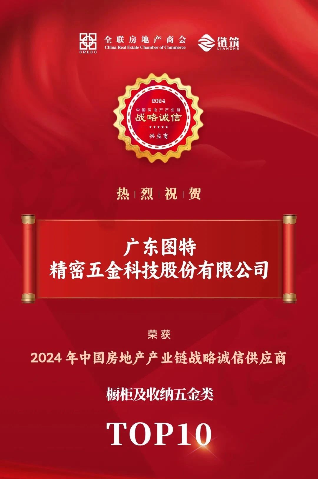 此次榮獲“2024年中國房地產產業(yè)鏈戰(zhàn)略誠信供應商”櫥柜及收納五金類TOP10,再次證明了圖特五金在行業(yè)內的影響力和市場認可度。未來,圖特五金將持續(xù)踐行“聚焦技術與服務創(chuàng)新,共創(chuàng)美好家居生活”的企業(yè)使命,以用戶需求為中心,以提升美好人居生活為己任,不斷提升產品品質和服務水平,為全球用戶打造一站式家居五金解決方案,攜手合作伙伴,打造高品質家居生活。