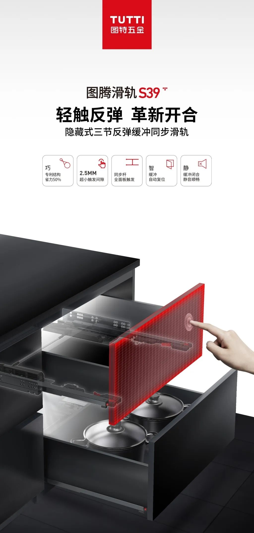 圖騰滑軌創(chuàng)新實(shí)現(xiàn)反彈開(kāi)啟+緩沖閉合功能一體,2.5mm超窄觸發(fā)距離升華抽屜美感,靈敏省力開(kāi)啟、全面板按壓觸發(fā)開(kāi)啟革新反彈抽屜開(kāi)合體驗(yàn)。
