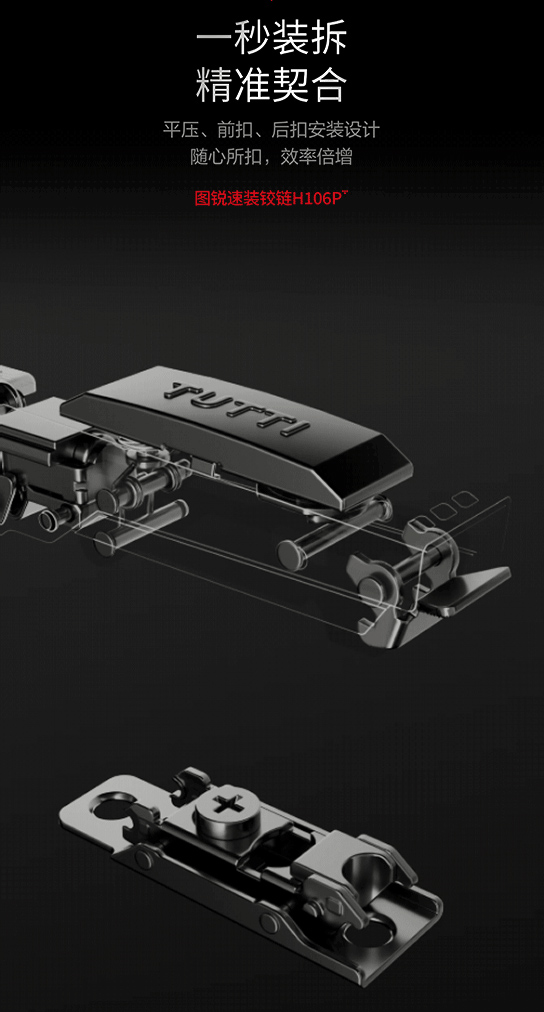 H106P圖銳速裝鉸鏈:憑借“一秒裝拆”的極簡快裝設計和專利阻尼技術,解決了高柜門安裝效率與靜音閉合的行業(yè)痛點,成為全球客戶熱議的“效率革命”。