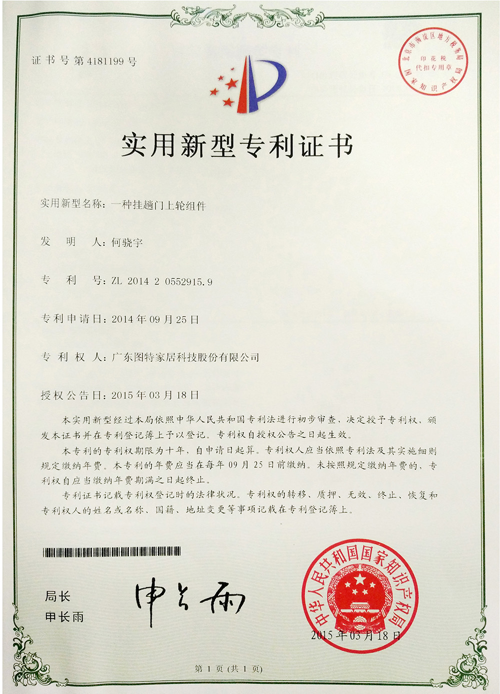 UTILITY MODEL PATENT(A TYPE OF HANGING DOOR UPPER WHEEL ASSEMBLY)