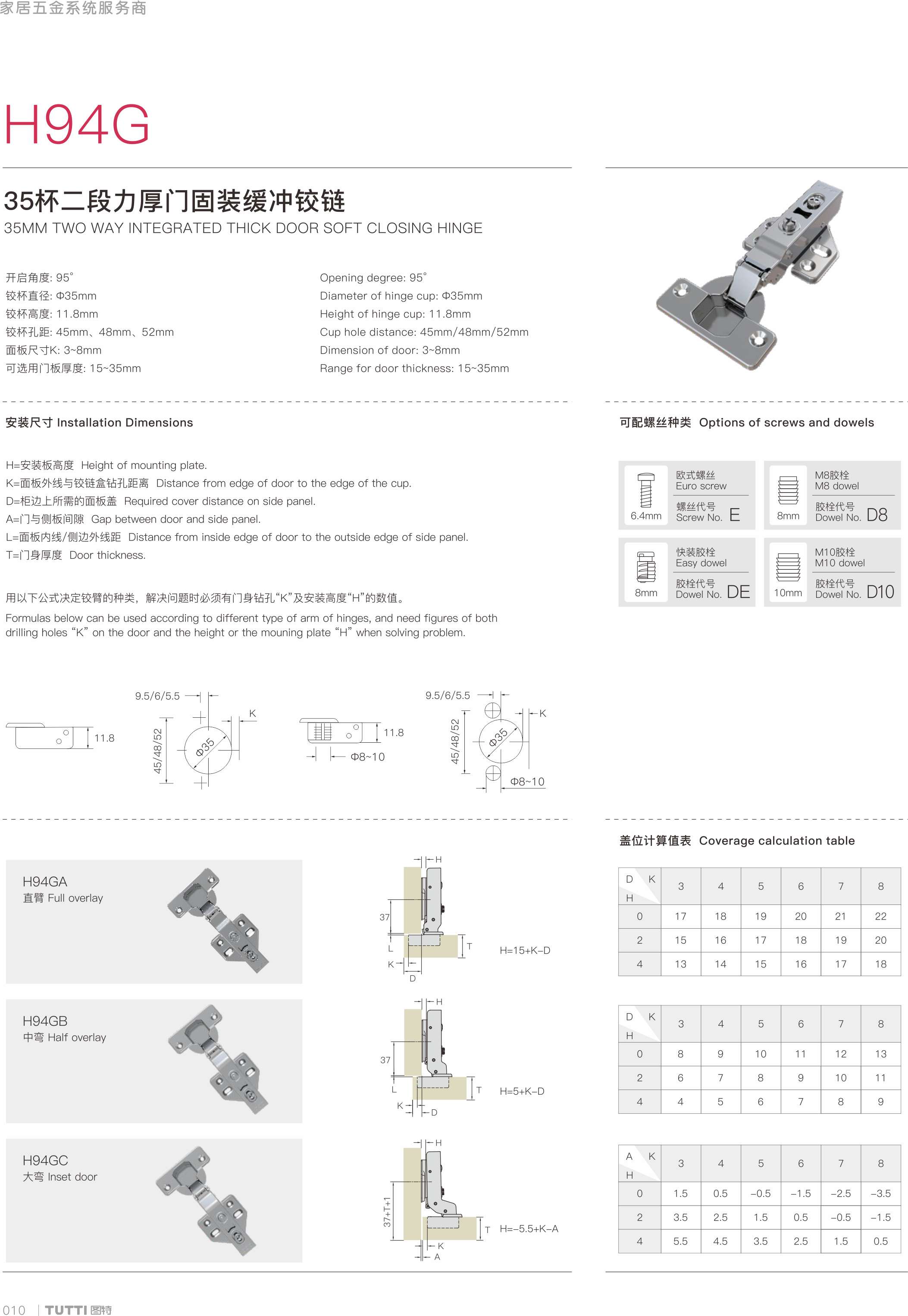 開啟角度:95° 鉸杯直徑:Φ35mm 鉸杯高度:11.8mm 鉸杯孔距:45mm、48mm、52mm 面板尺寸K:3-8mm 可選用門板厚度:15-35mm