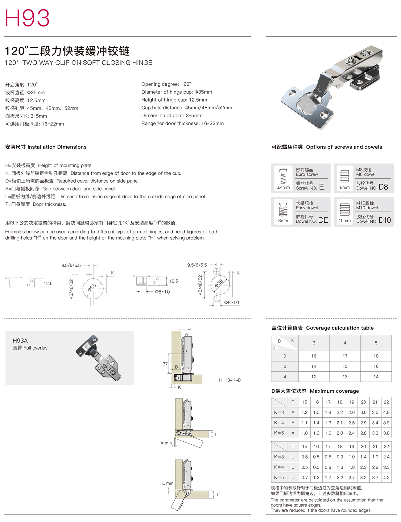H93 120°二段力快裝緩沖鉸鏈