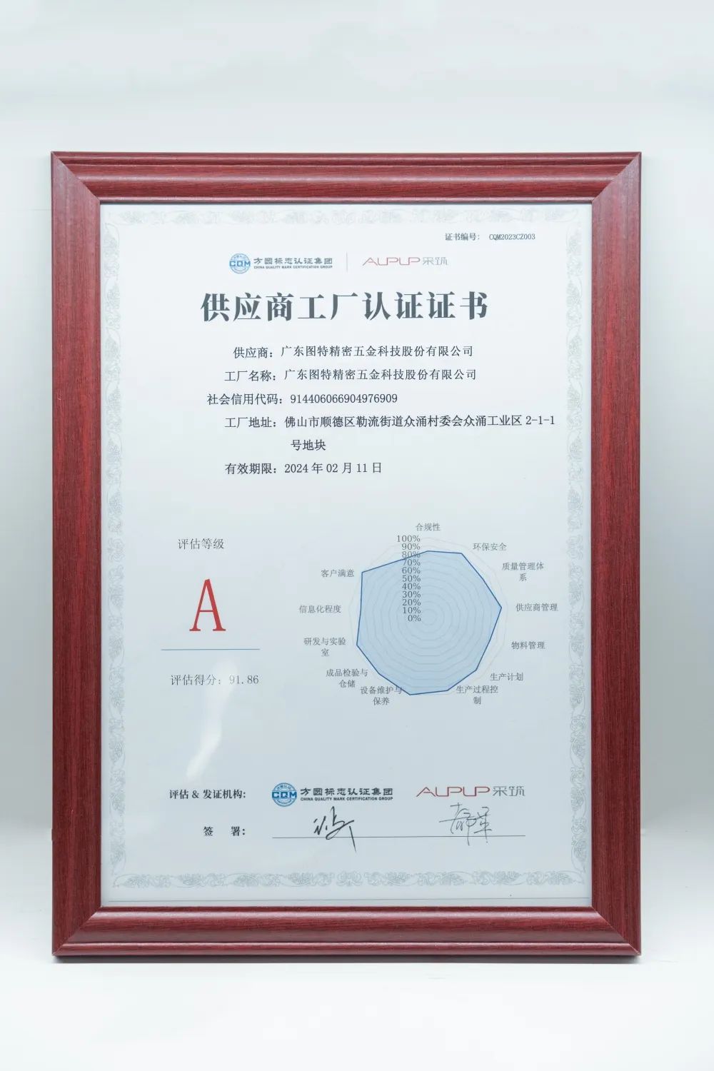 高光時(shí)刻丨躋身地產(chǎn)采購(gòu)屆“奧斯卡”,圖特五金獲采筑平臺(tái)供應(yīng)商工廠A級(jí)認(rèn)證